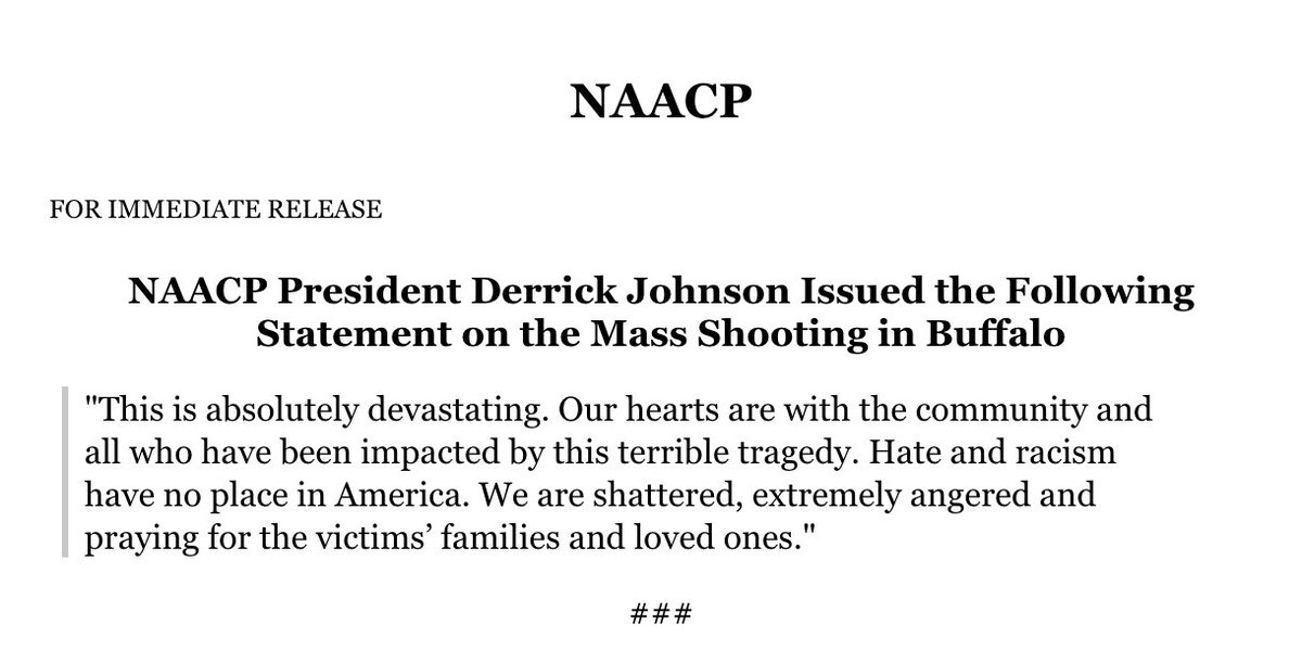 @NAACP on the deadly Buffalo, NY shooting, "Hate and racism have no place in America." President@DerrickNAACP added, This is absolutely devastating. Our hearts are with the community and all who have been impacted by this terrible tragedy."pic.twitter.com/UPq0pnaTrZ