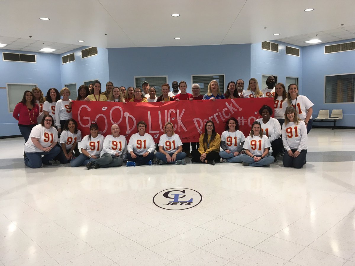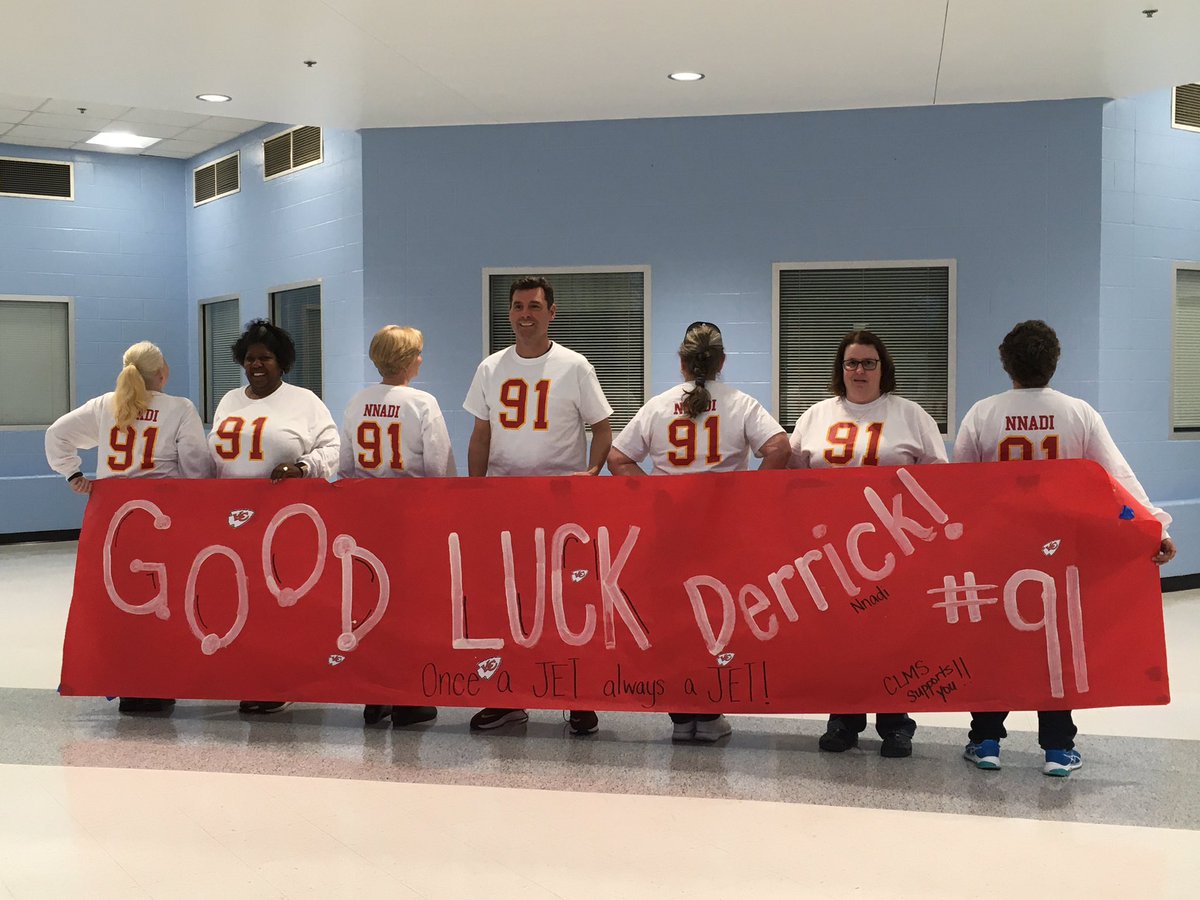 @DerrickNnadi’s middle school alma mater,@CLMSJETS in@vbschools, wore tshirts today to support the@Chiefs defensive lineman in advance of Sunday’s#SuperBowl.#ChiefsKingdom