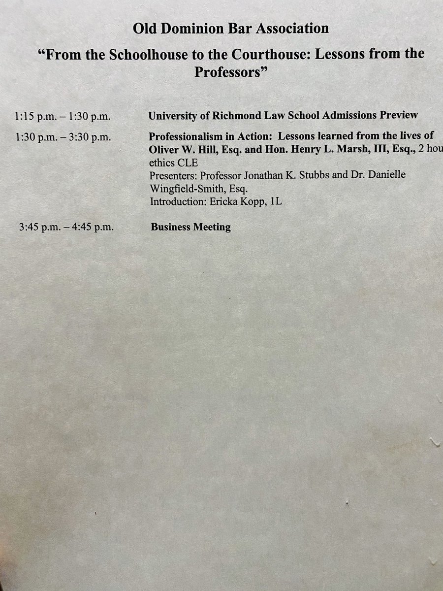 commemorating the Old Dominion Bar Association’s 80th year! Had the opportunity to speak about “Professionalism in Action: Lessons learned from the lives of Oliver W. Hill, Esq. & Hon. Henry L. Marsh, III, Esq.” w/ Prof Jonathan Stubbs @URLawSchoolpic.twitter.com/wjfIDl03IZ