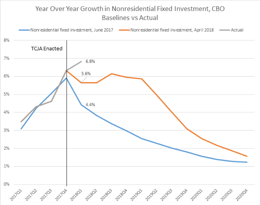 The colored lines represent @USCBO investment projections before #TaxReform. The grey line represents actual investment in facilities, equipment and technology, because of the new law. Much better now!pic.twitter.com/07ZOAToPlz