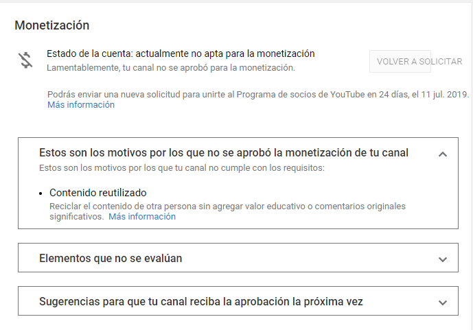 Si tu contenido ha sido considerado como reutilizado significa que hemos encontrado material que coincide con el de otro o es similar. Aquí más información sobre nuestras políticas: http://yt.be/help/AsbB . Recuerda que también puedes aplicar de nuevo en 30 días. Saludos.