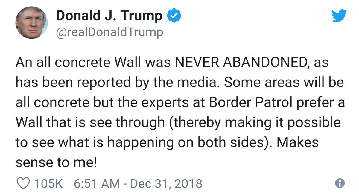 #Individual1 is now saying he wants a steel wall because it's stronger than concrete. This guy is all over the place. Reminder from just a few days ago:pic.twitter.com/DDH3uc4wGh