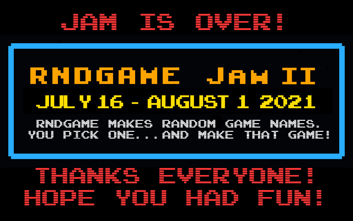 RNDGAME JAM iiiiiiis over! Thanks to the over 400 participants and the 89 folks who finished games. Hope you all had a bunch of fun! Feel free to use RNDGAME in the future!