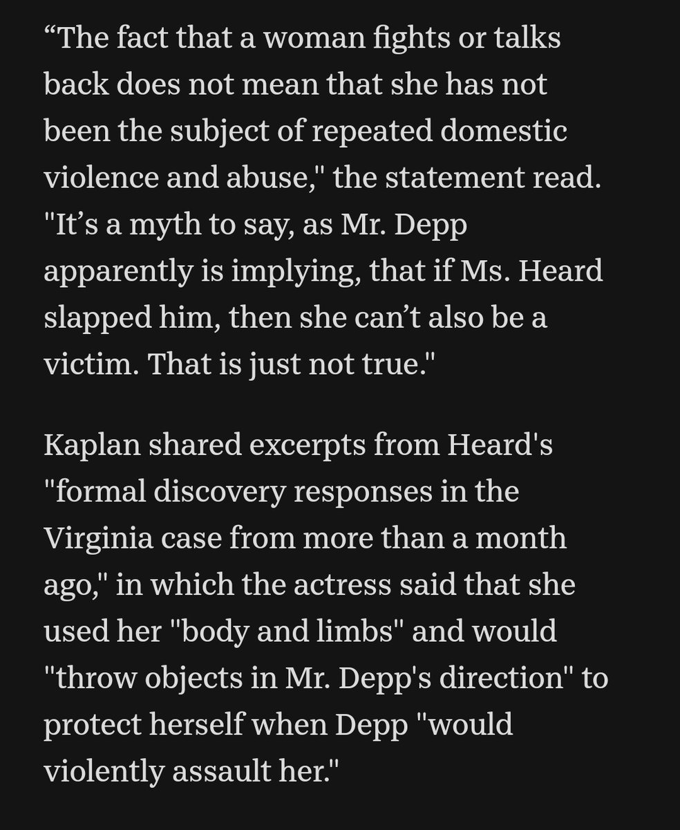 https://www.usatoday.com/story/entertainment/celebrities/2020/02/02/johnny-depp-amber-heard-perpetrated-serial-violence-lawyer-says/4639763002/ … "The fact that a woman fights or talks back does not mean that she has not been the subject of repeated domestic violence" No, it doesn't, except at no time does she accuse him of touching her except in response to her hitting him.