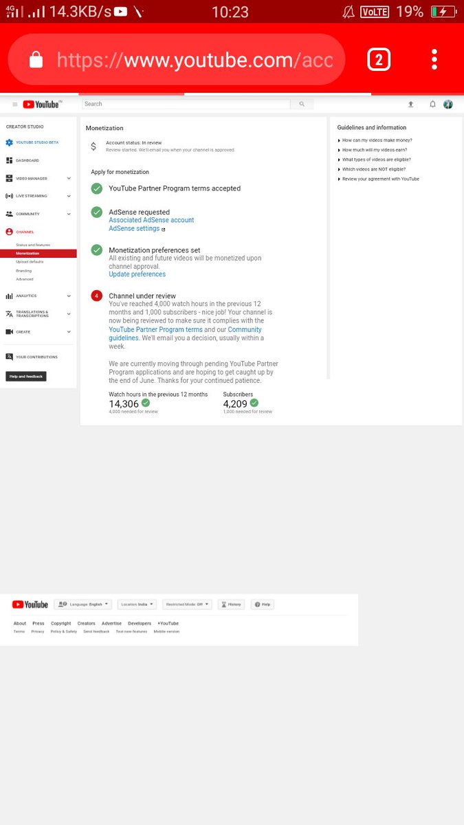 Helo@Team youtube my channel is completed the 4k+ hours watch time & 1k subscribers in previous 12 months and still My channel is not enable plz guide us. My youtube channel -https://www.youtube.com/channel/UC_ENoOolpEQjGUoRxBUEfVw …pic.twitter.com/GV9lKk4bAn
