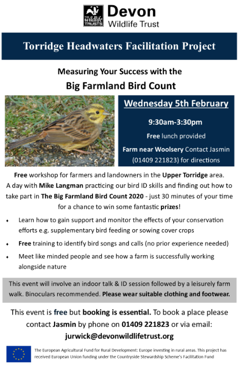 FREE training for the Big Farmland Bird Count for Upper Torridge farmers & landowners, Weds 5th Feb! Learn how to monitor results of land management through this national survey! More here: https://buff.ly/2GMovMN