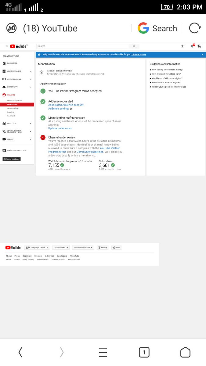 Hello @TeamYouTube My channel is completed the 4K+ hours watch time & 1K+ subscribers in previous 365 days and still my channel monetization is not enabled plz guide us. Channel link: https://www.youtube.com/channel/UCgdb_SCmiILiGDQntlhL7uA … thank you