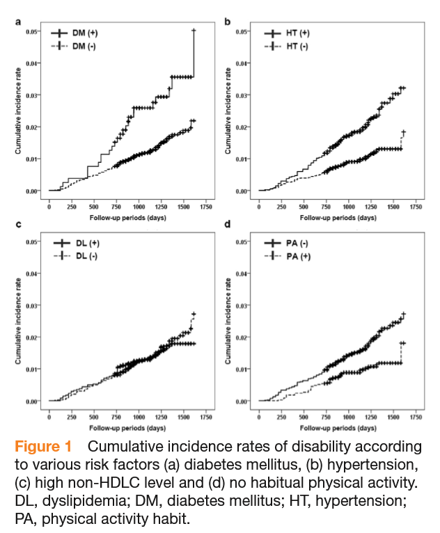 The combination of diabetes and lack of habitual physical activity is predictive of functional disability in Japanese. Habitual physical activity attenuates the risk of functional disability in patients with