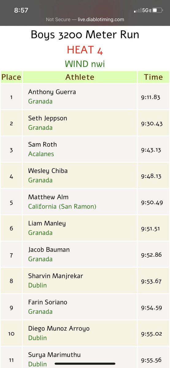Another amazing time! Anthony Guerra (Granada) wins boys 3200 in state leading time of 9:11.83! And with that another edition of Dan Gabor Invitational comes to a close!