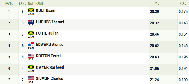 Full results from the men's 200m won by @usainbolt. It might not have been quick but the crowd loved it!pic.twitter.com/vlIcO0LI21
