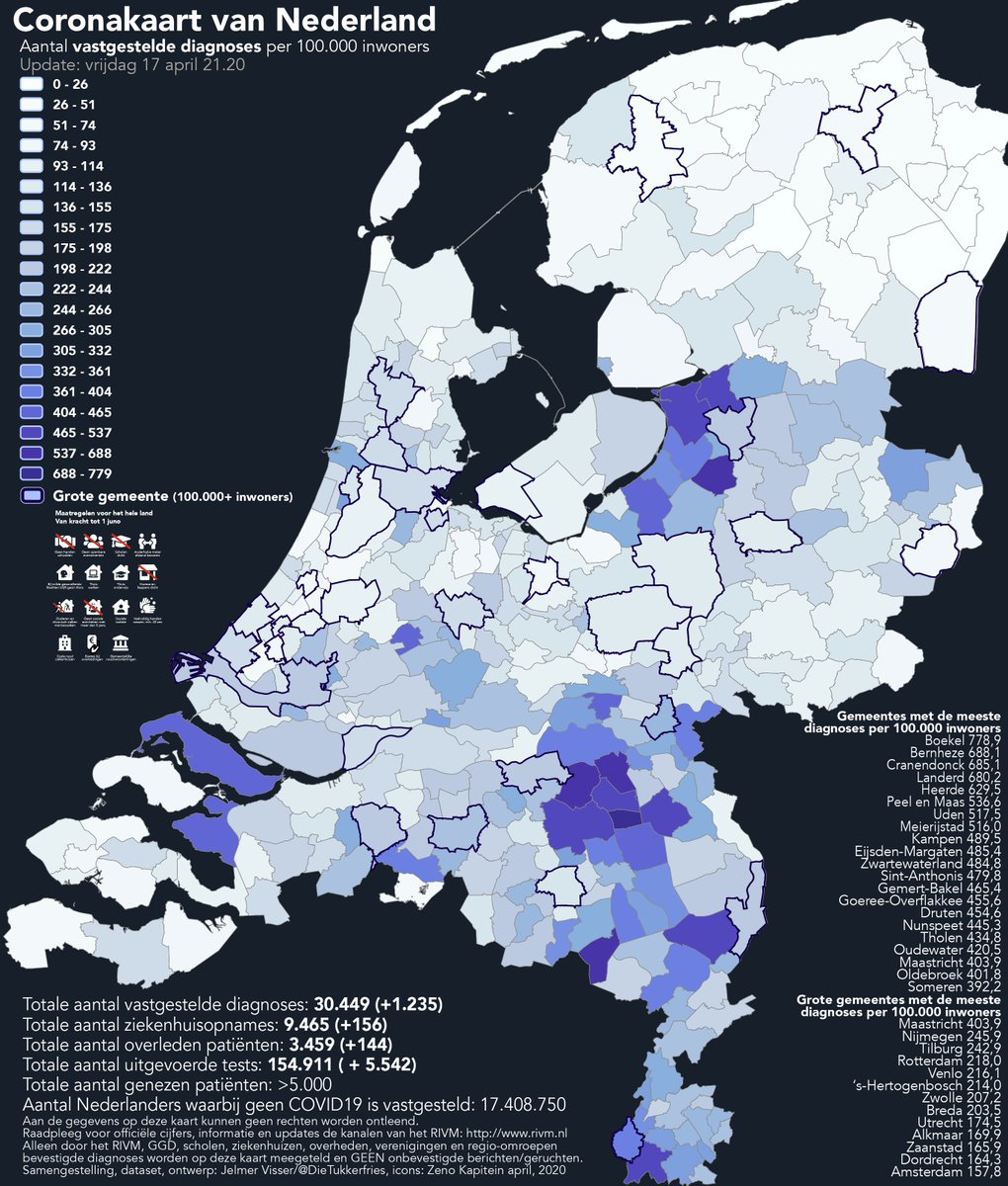 Ter vergelijking; dit is de Coronakaart van 17 april. Dit was onze 'piek'. Toen werden er 1235 nieuwe diagnoses per dag(!) gemeld. Iets minder dan 2 maanden later zitten we op 1304 per week(!) Overledenen en opnames waren toen in één dag ook hoger dan in deze hele voorbije week.pic.twitter.com/BmHz4S3oPW