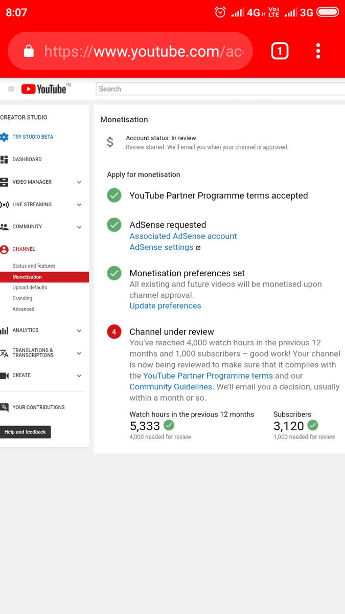 @TeamYouTube Dear Team YouTubel have already completed 4k hour And 1k Subscriber In previous 12 month and my channel is under review till One month.but monetization is not enable.pls guide us. http://Www.YouTube.com/dilkashtv  Link:https://www.youtube.com/channel/UClo65j7feTSaJJbeUdMKkfA … EMail : alambachharpur2@gmail.compic.twitter.com/D6ctDmRWEu