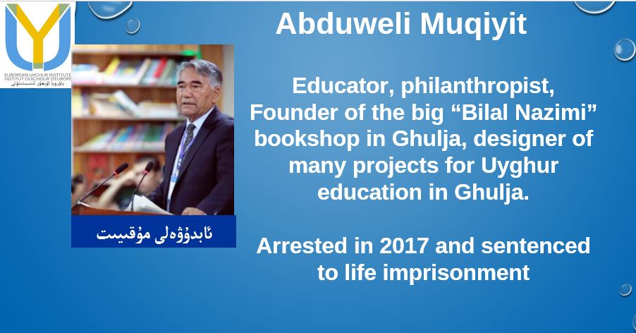 Hier soir j'ai appris qu'Abduweli Muqiyit et Nurtay Hajim ont été tous les deux condamnés à la prison à vie. Les professeurs de l'école des orphelins de Ghulja ont tous été arrêtés. Nurtay Hajim Iskandar, Ablimit Halis Hjaim et Abduweli Muqiyit étaient les piliers de l'éducation.https://twitter.com/UyghurInstitute/status/1266336910085062656 …