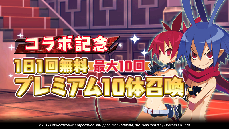 \魔界の最凶キャラクターを揃えるッス!/ 期間中、毎日10体、最大10日間利用できる「コラボ記念 最大100体無料プレミアム召喚」開催中ッス! 5回目と10回目には「★4キャラクター」が1体以上確定ッスよ! 特に、