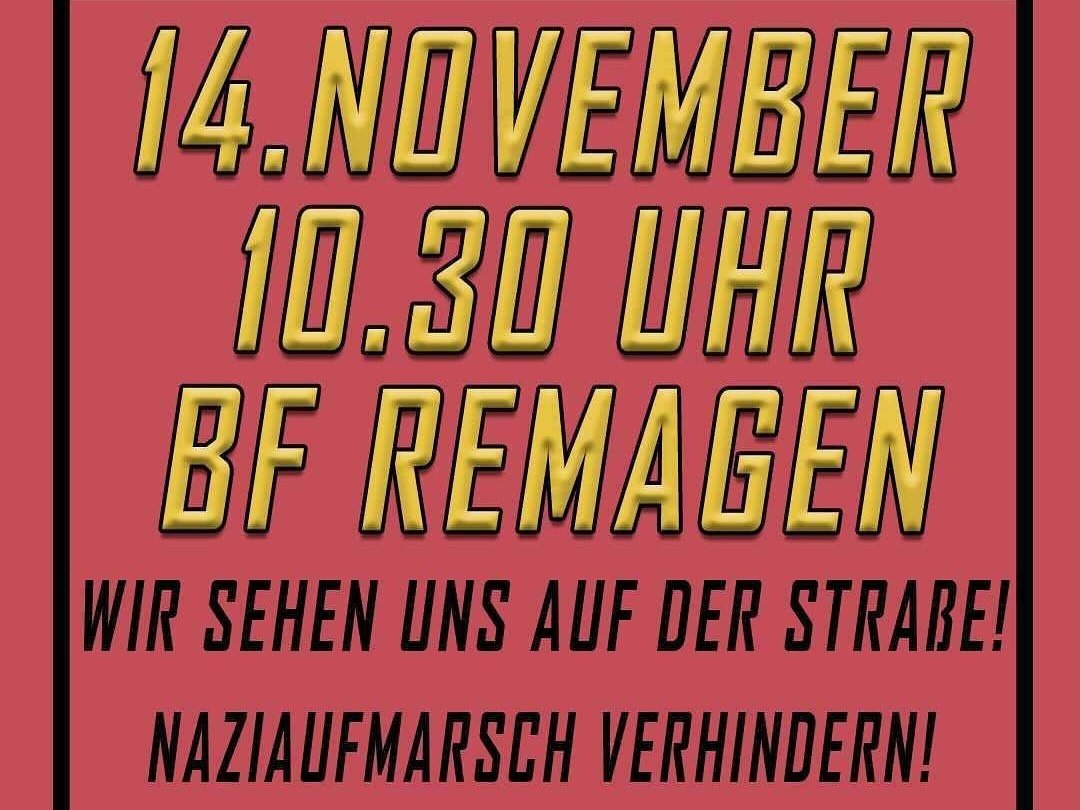 Seit langem haben wir es vermutet, nun ist es offiziell: Auch dieses Jahr wollen Faschist*innen wieder in Remagen aufmarschieren. Kommt daher am 14. November mit nach Remagen, um den größten regelmäßigen Naziaufmarsch Deutschlands in seine Schranken zu weisen!pic.twitter.com/Nfvm7NpYQr