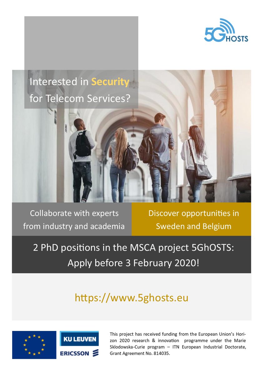 @EricssonLabs we are looking for 2 PhD students to work on security and privacy for telecom in the context of the@MSCActions project 5GhOSTS. More info at http://5ghosts.eu and https://jobs.ericsson.com/main/jobs/316843 …. The call for applications is open until February 3!pic.twitter.com/BkkRuxnYHo