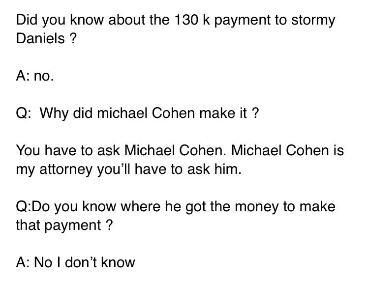 Aboard Air Force One, President Trump told reporters that he did not know that his personal attorney paid adult-film star Stormy Daniels $130,000 days before the presidential election. Trump also said he doesn’t know where Cohen got the money.