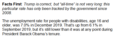 Trump is correct with most of these claims about unemployment rates reaching an all-time low, but "all-time" is not very long in some cases. For example, the rate for people with disabilities only goes back to 2008.pic.twitter.com/IYnGyB2d7S