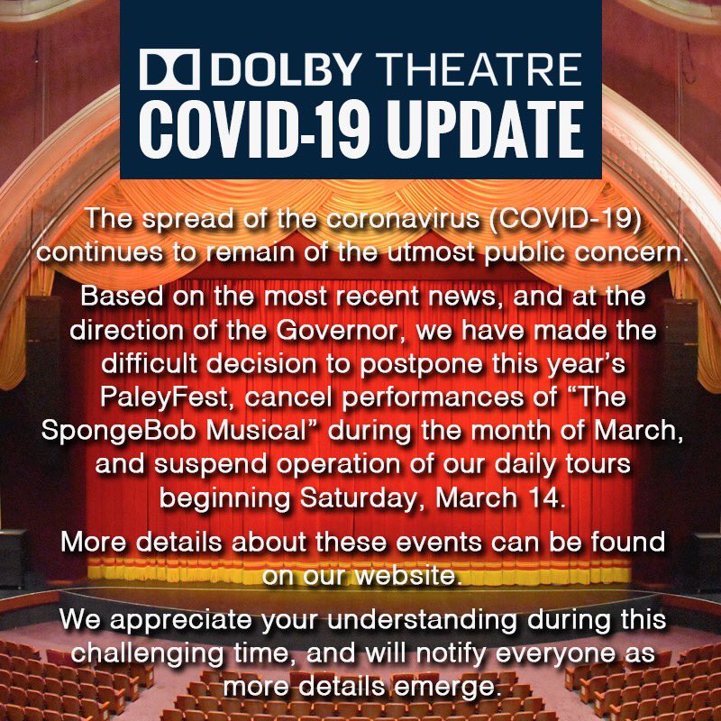 Our current statement as of 3/12/2020 regarding COVID-19 and events in our theatrepic.twitter.com/KftOj548Uu