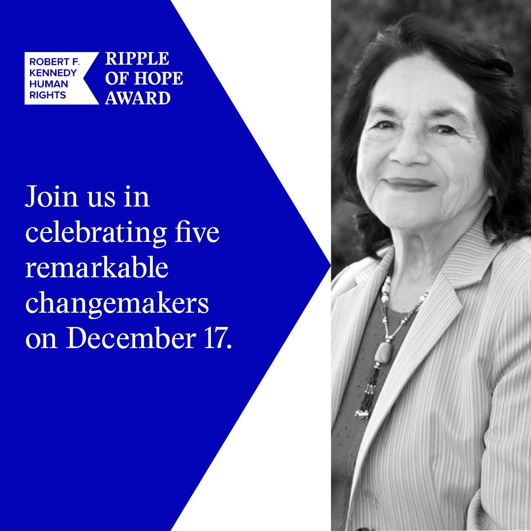 @DoloresHuerta! Tune in to this year’s#RippleofHope Award ceremony hosted by@RFKHumanRights and@KerryKennedyRFK and hear her moving message of hope. The#RFKAwards premiere on Facebook on 12/17 at 7pm EDT: https://www.facebook.com/RFKHumanRights/ pic.twitter.com/p8uvVGhjwU