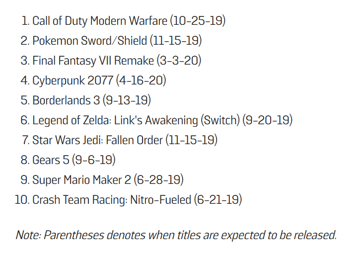 Top 10 Most Pre-Ordered E3 Games, GameStop: 1. CoD: Modern Warfare 2. Pokemon Sword & Shield 3. FFVII Remake 4. Cyberpunk 2077 5. Borderlands 3 6. Link's Awakening 7. Star Wars Jedi: Fallen Order 8. Gears 5 9. Super Mario Maker 2 10. Crash Team Racing https://gamestop.gcs-web.com/news-releases/news-release-details/post-e3-gamestop-reveals-top-10-video-games-based-customer …pic.twitter.com/pA4aw85rEw