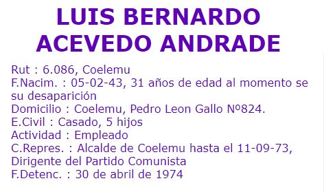 Fue detenido x carabineros en su casa, mientras estaba almorzando con su familia. Fue llevado con otros detenidos a Tomé y a la cuarta comisaría de Concepción; allí fue torturado y visto x última vez: https://www.memoriaviva.com/Desaparecidos/D-A/ACEVEDO_ANDRADE_LUIS_BERNARDO.htm …