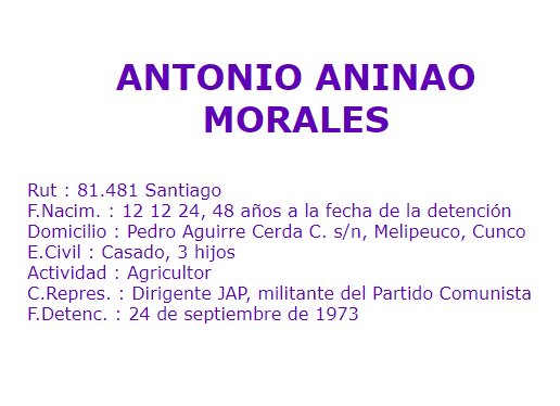Fue liberado del retén Llaima bajo obligación de firmar 3 veces x día. El 24-9 quedó detenido tras ir a firmar, desde entonces se desconoce su paradero. Su esposa fue amenazada x carabineros con "hacerle lo mismo q a su esposo" si seguía preguntando x él: http://www.memoriaviva.com/Desaparecidos/D-A/ani-mor.htm …