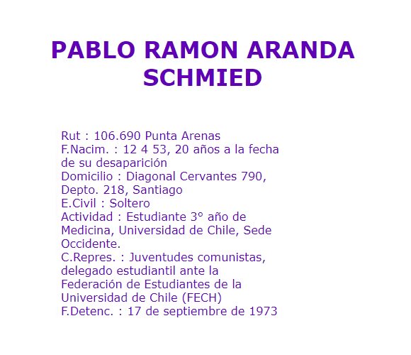 Fue secuestrado x militares de San Felipe al interior del hospital San Juan de Dios, en donde hacía su práctica. Habría sido asesinado en 1 sitio eriazo de calle San Pablo, pero su cadáver hasta ahora está desaparecido: http://www.memoriaviva.com/Desaparecidos/D-A/ara-schm.htm …