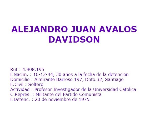 Lo secuestraron en el centro de Stgo, y lo llevaron a Villa Grimaldi, de donde lo hicieron desaparecer en febrero de 1976. El UDI Carlos Bombal, q entonces trabajaba en la PUC, dio sus datos a los agentes DINA, contribuyendo así a su desaparición forzada: http://www.memoriaviva.com/Desaparecidos/D-A/ava-dav.htm …