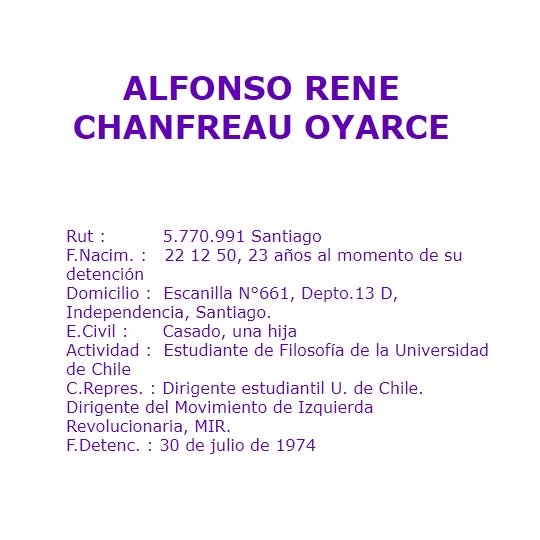 Lo detuvieron en su casa, en Independencia; lo llevaron junto con su esposa a Londres 38, en donde fueron torturados. De allí lo sacaron con rumbo desconocido (aparente% a Colonia Dignidad) el 13-8-74, con otros prisioneros, estando desaparecido hasta hoy: http://www.memoriaviva.com/Desaparecidos/D-C/cha-oya.htm …
