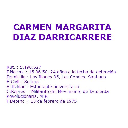 La detuvieron en su casa en Las Condes junto con Iván Montti (tbn DD) y su hijo; cn otros detenidos fue llevada a Villa Grimaldi, siendo torturada y hecha desaparecer a fines d febrero. El niño tbn fue llevado a la Villa, y encontrado en 1 hogar d menores: http://www.memoriaviva.com/Desaparecidos/D-D/dia-dar.htm …