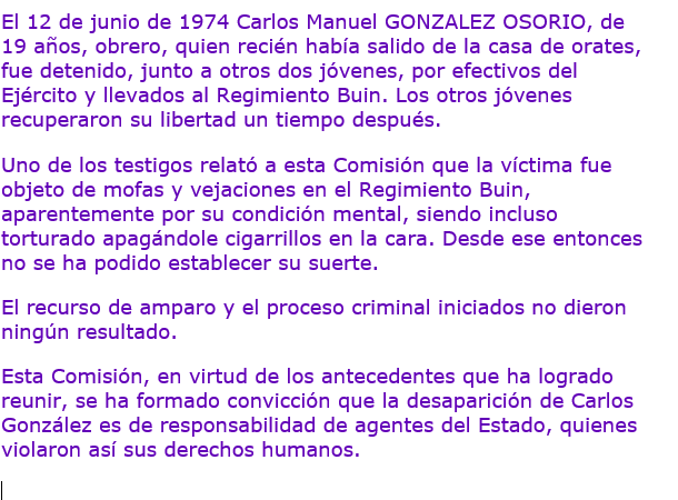 Menor de edad en la época, fue objeto de burlas en el regimiento x su condición mental, y tbn torturado (le quemaron cigarrillos en su cara). Los 2 jóvenes q lo acompañaban fueron liberados, pero de la víctima nunca más se supo: http://www.memoriaviva.com/Desaparecidos/D-G/gonzalez_osorio_carlos_manuel.htm …