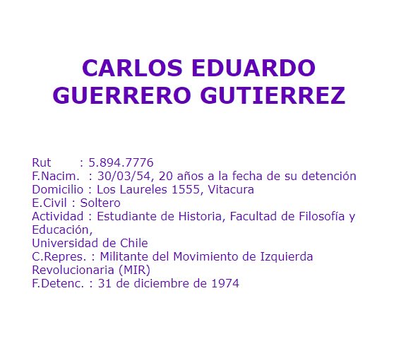 Menor de edad en esa época, intentó huir pero fue herido a bala en la calle en Ñuñoa; lo llevaron a Villa Grimaldi, donde fue torturado y de donde lo sacaron con rumbo desconocido el 25-1-75. Hasta hoy se ignora qué le ocurrió:http://villagrimaldi.cl/noticias/suprema15-anos-de-carcel-por-desaparicion-de-carlos-guerrero-gutierrez-y-claudio-contreras-hernandez-en-villa-grimaldi/ …
