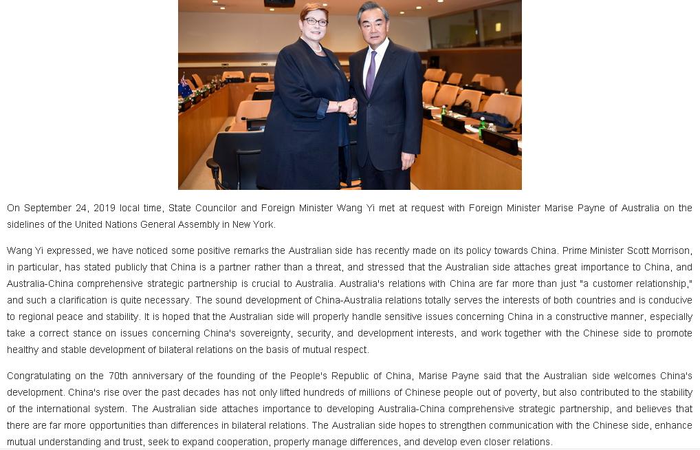 State Councilor and Foreign Minister Wang Yi met with Foreign Minister Marise Payne of Australia on the sidelines of the United Nations General Assembly in New York.He said we have noticed some positive remarks the Australian side recently made on its policy towards China.pic.twitter.com/1tpV0tW5HP