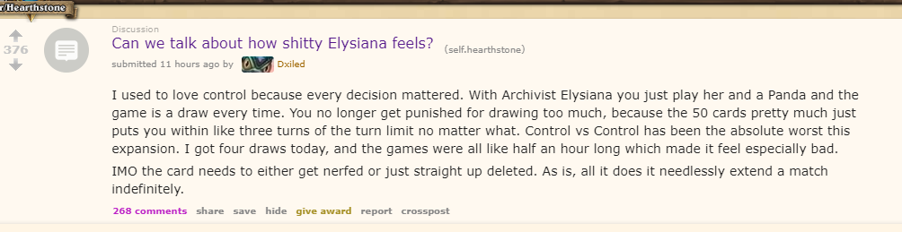 My post 1 week before expansion VS todays reddit post. It wasn't premature. It is very easy to predict that people will abuse infinite value mechanics in control. i always said that infinite value mechanics are terrible in a resource based game, not every class can win with tempopic.twitter.com/Xi8GWtNnnI