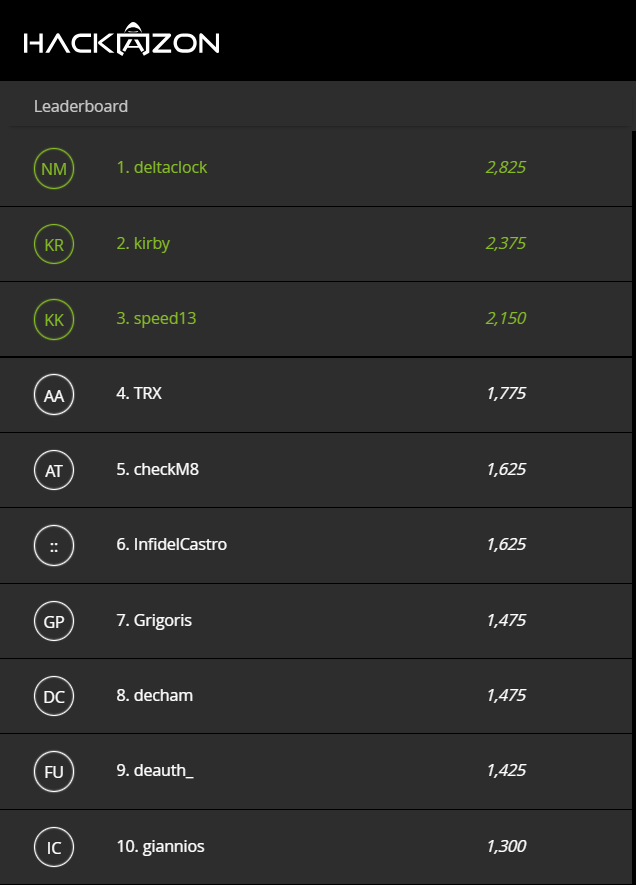 Competition gets higher! InfidelCastro is now in 3rd place, with five players in close distance! 3 days to go! You can still register and claim one of the 40 tickets for the finals at: https://greekhackingchallenge.hackazon.org