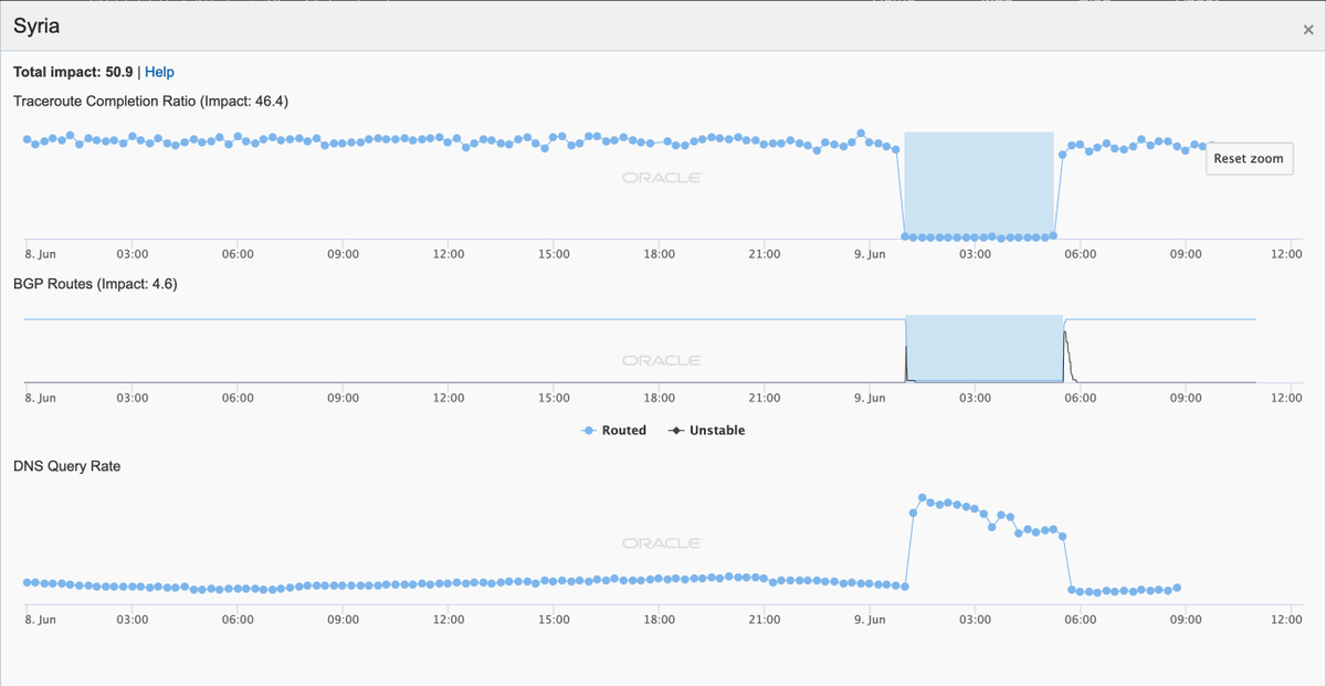 #Internet in #Syria completely shut down between 01:00-05:30 UTC today, likely related to first day of 12th Grade (A-Level) public exams. #Outage visible in @InternetIntel amnd @caida_ioda tools. #KeepItOn https://twitter.com/ahmadalissa/status/1137486185343922178 …pic.twitter.com/Lh02qGqyUv