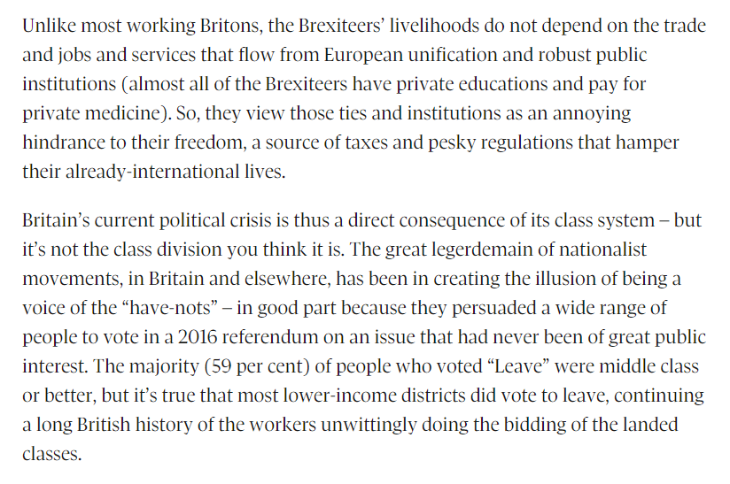 A big reason why Brexit negotiations are bogging down -- Britain is now governed by cosmopolitan "anywheres" who have their own privately financed links to the world and do not depend on international institutions and trade for their livelihoodshttps://twitter.com/DougSaunders/status/1191278063818018817 …
