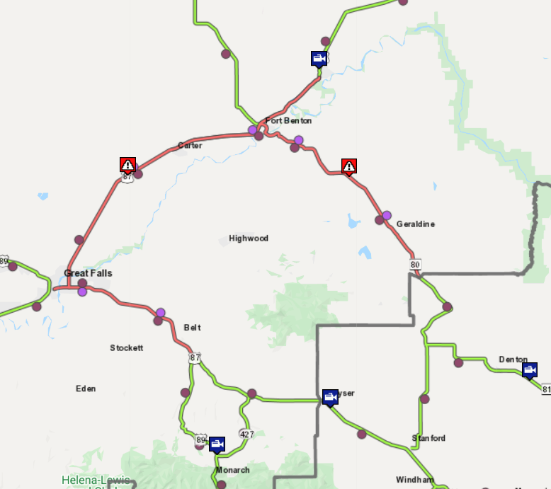 3:50 pm Saturday: MDT reports all major highway routes east out of Great Falls are now closed (indicated by solid red designation) due to the impacts from the high winds causing near-zero visibility & extremely difficult travel conditions.