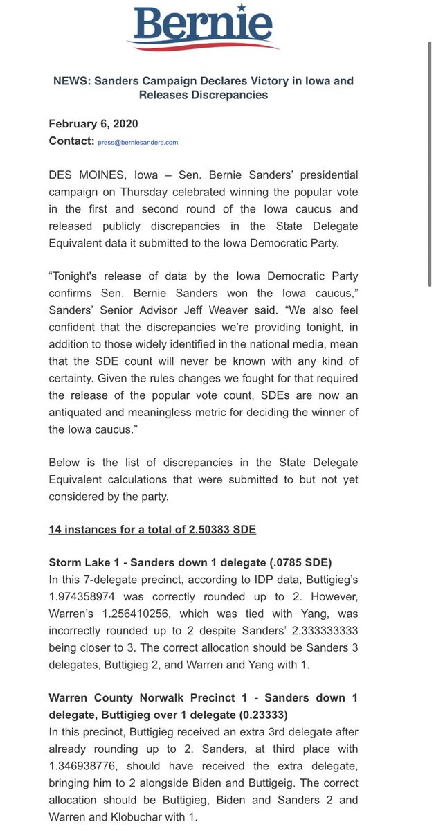 @BernieSanders campaign declares victory in the Iowa Caucus, calls the SDE totals an "antiquated and meaningless metric" and says the count "will never be known with any kind of certainty." Releases a bunch of discrepancies in precincts they think will boost Sanders:pic.twitter.com/QJ0ti6oWlQ