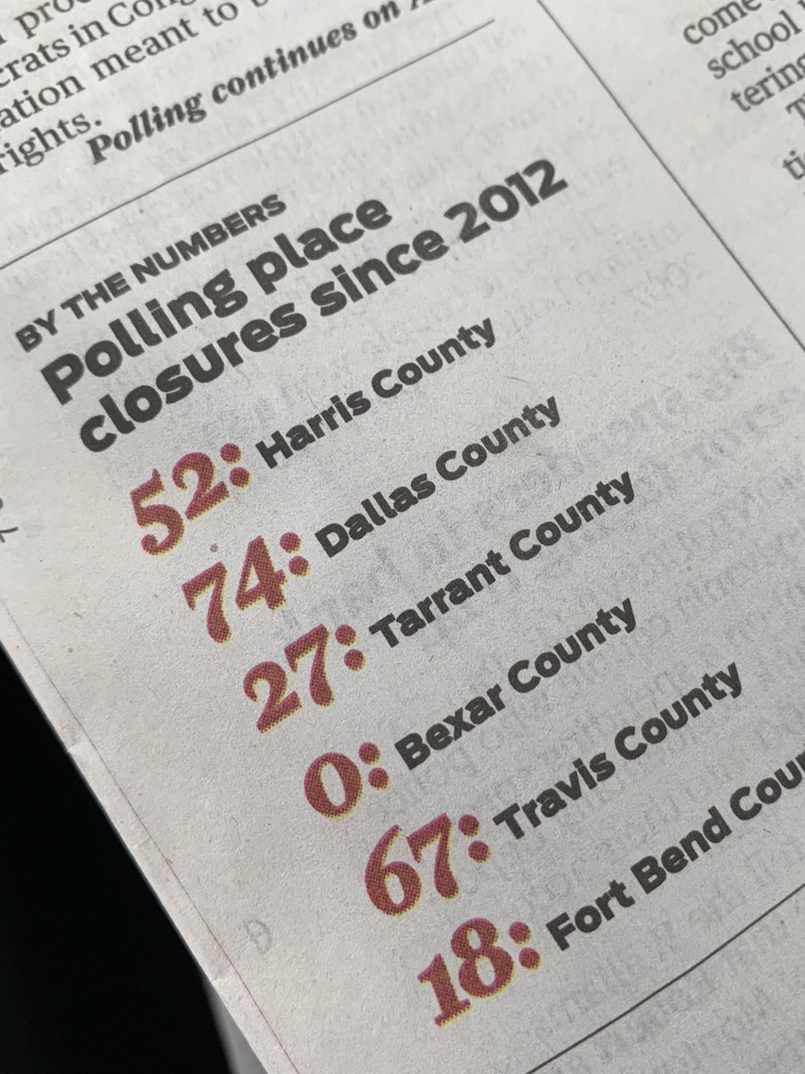 Front page of today’s @HoustonChron - Texas has closed a whopping 750 polling places since 2012, the most of any state https://www.google.com/amp/s/www.houstonchronicle.com/news/politics/texas/amp/Texas-has-closed-more-polling-places-than-any-14429443.php …pic.twitter.com/G8Zf7YdHyc