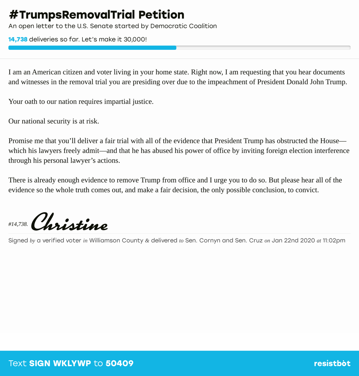 @resistbot can help you sign a letter to your Senators telling them to allow witnesses and evidence in the impeachment trial. It just takes a few clicks.https://twitter.com/openletterbot/status/1220195322783076353 …