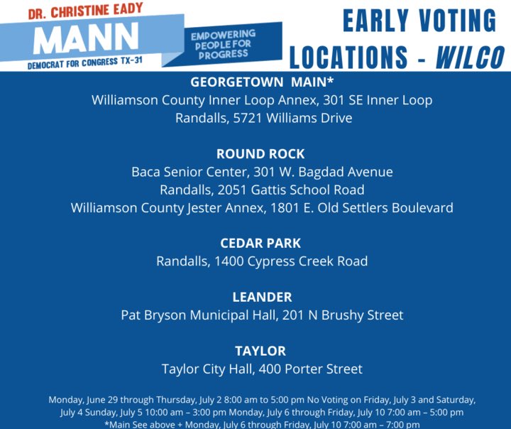 @DrChristineMann for Congress in TX31. You have until July 10th to vote early. Election Day is July 14th. Christine Mann is the candidate that can send Carter packing & flip this district blue.Thanks. Twitter will use this to make your timeline better. UndoUndo