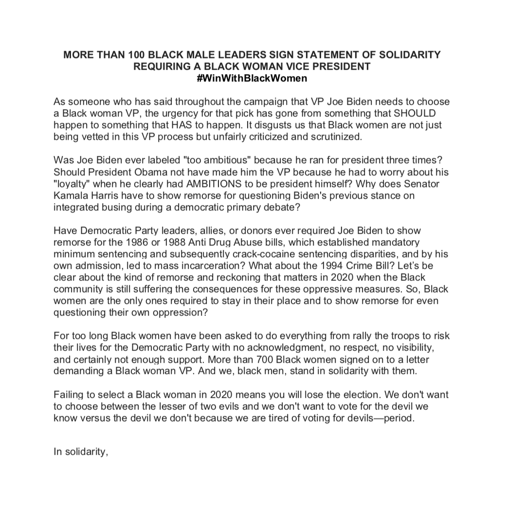 An open letter from 100 prominent Black men — including @Diddy @cthagod @RevDrBarber @CP3 @AttorneyCrump — has a blunt message for Joe Biden: "Failing to select a Black woman in 2020 means you will lose the election. We don't want to choose between the lesser of two evils."pic.twitter.com/tN4qolv1EI