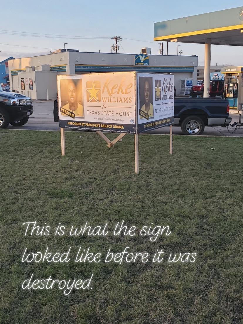 In Bell County, Texas, they are running scared and fighting dirty. Another one of @kekefortexas signs has been destroyed. She will be our next State Representative and some establishment folk and their supporters can’t stand it.#UnscrupulousRepublicans #WhiteNationalistspic.twitter.com/8OVoXNy6So