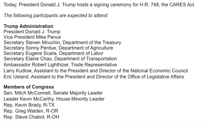 When President Trump signs the historic $2 trillion coronavirus bill -- the largest single stimulus package passed by Congress -- he will be surrounded by Republicans. Not one Democratic has been invited, per WH list. It appears Pres Trump & Speaker Pelosi still aren't speaking.pic.twitter.com/ISwZaAyNQs