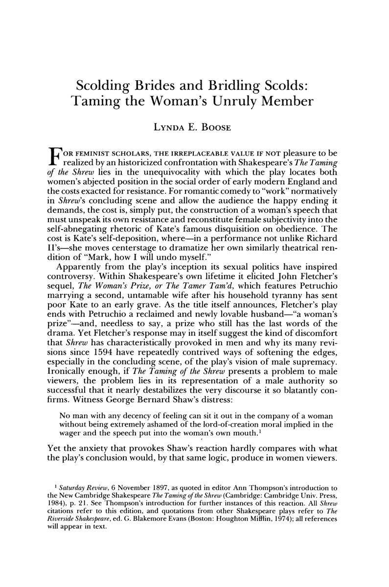 I find Lynda Boose's article "Scolding Brides and Bridling Scolds Taming the Unruly Mumber," remains valuable in teaching Shrew. It pairs well with