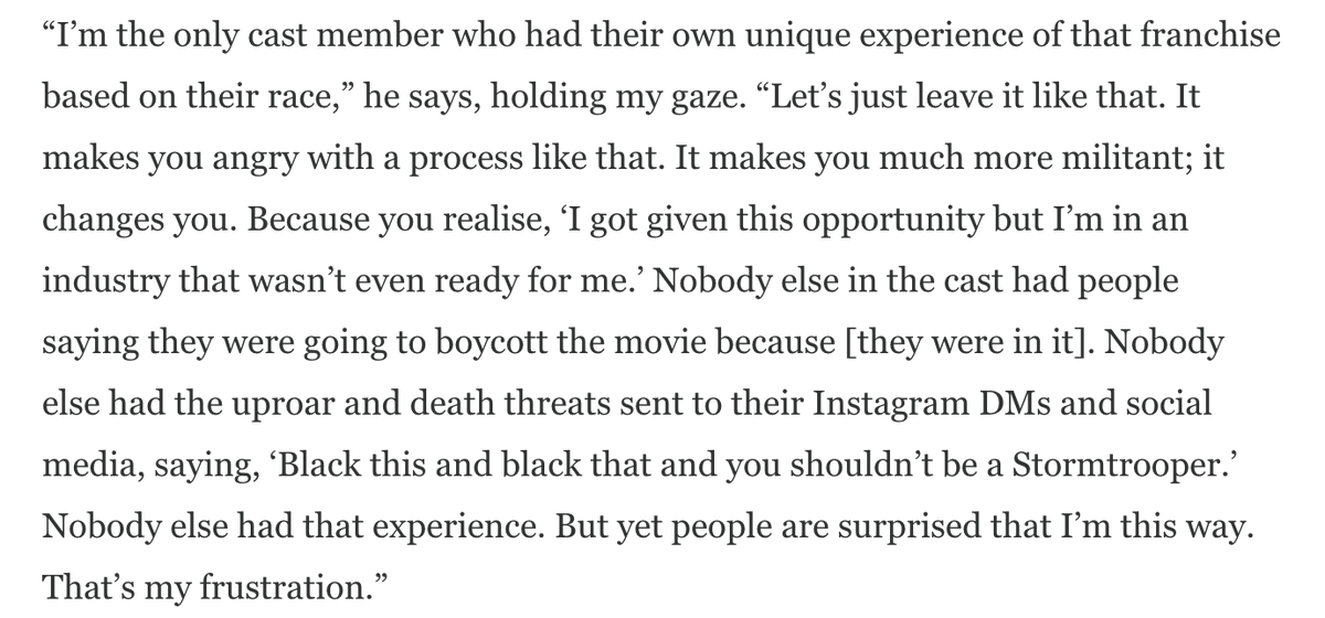 'I’m the only cast member whose experience of Star Wars was based on their race.' Powerful words from @JohnBoyega on the suffocating pressure of white supremacy. https://www.gq-magazine.co.uk/culture/article/john-boyega-interview-2020 …pic.twitter.com/jTuzgiP4C0