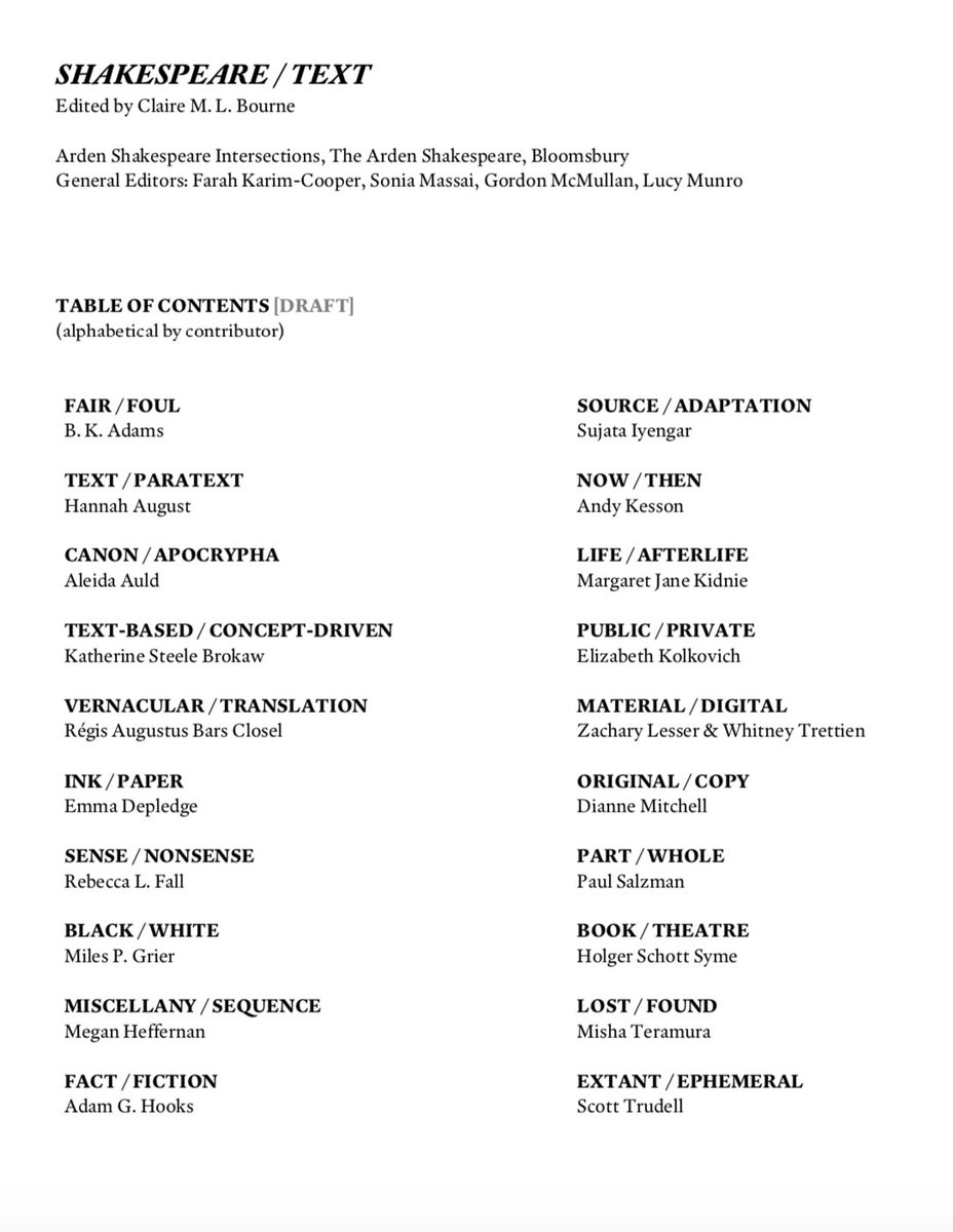 i had to pinch myself as i drafted this TOC for SHAKESPEARE / TEXT (forthcoming @BloomsburyAcad). i'll say this 100x more, but thank you to everyone who has supported this project so far. your words, affirmations, & critiques have been invaluable. time to write the intro!pic.twitter.com/8bjRvZhWfj