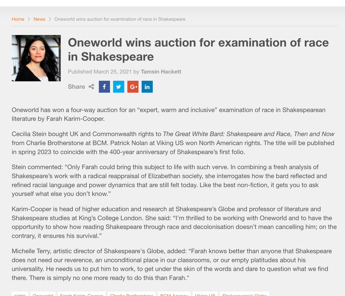 Congratulations to @ProfFarahKC! Can't wait to read this desperately needed non-fiction trade book on Shakespeare, race, and power. #ShakeRace https://www.thebookseller.com/news/oneworld-publish-fresh-examination-race-shakespearean-literature-1250154 …